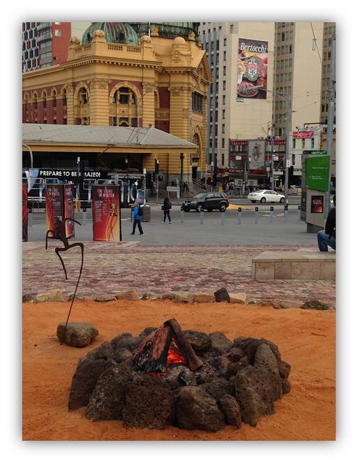 I’m still too early when I hit the city but ACMI is at Federation Square so I grab another coffee and wander around a bit, realising with surprise that I haven’t actually seem this touristy square properly til now. Strangely I smell bushfire and notice a campfire blazing in the middle of the square – an art piece in recognition of the indigenous community. It’s a pretty freezing day and although the fire gives off little to no heat, just the smell is enough to warm me up.
