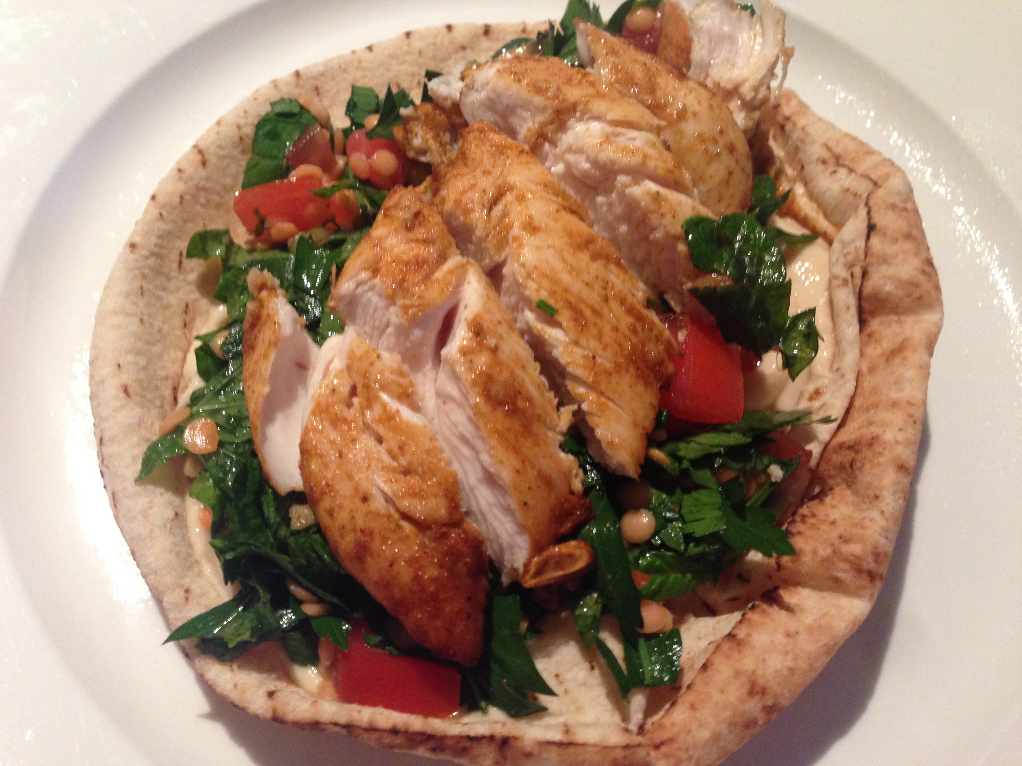 Then, it’s literally a matter on spreading on some hummus and adding the salad & chicken! So good and a good “kebab” type fix.