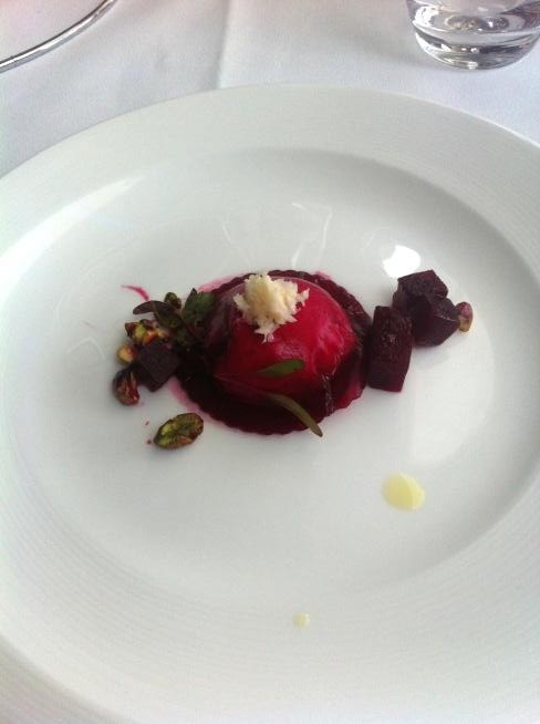 After about an hour of feeding our artistic appetites we decide that we’ve earned an equally cultural lunch, Otto at Woolloomooloo. We manage to make a very last minute booking on the walk down given it’s about 2PM and the lunch rush is over and we’re surprised but excited to be seated right on the water’s edge of the restaurant. Since we’re splurging (by our standards), we take care when ordering and settle on 3 entre type courses, each. To say the food was good is an understatement. I’ve heard many reviews of Otto and understand that we must have ordered very well because it’s rumored to be hit and miss. We start with ravioli of finely sliced picked beetroot with goat’s curd, pistachio and horseradish followed seared scallops & black pudding. We finish with a three cheese soufflé which is so